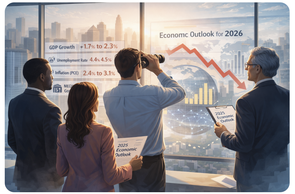 Taken together, the forecasts describe an economy entering 2026 with momentum that is fading but still intact: inflation is expected to cool further, interest rates are expected to drift lower, and growth is expected to continue — though at a pace that leaves little room for policy mistakes or external shocks.